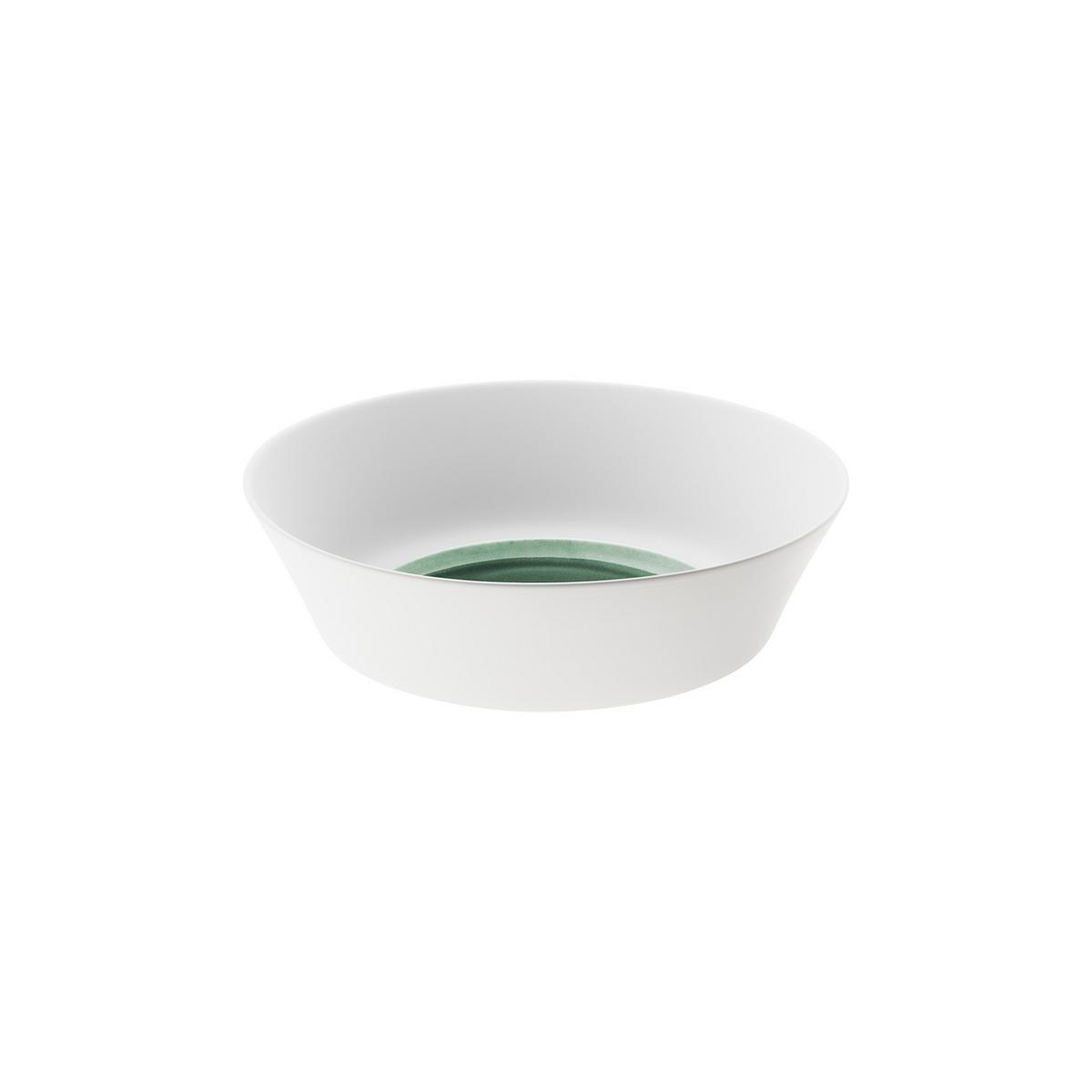 Der Rand der Teller "Emerald" ist aus mattem, samtig weich geschliffenem Biskuit-Porzellan. Im Kontrast dazu bestechen die Spiegel der Teller durch einen glänzenden Grünton. Die lebendige Hochbrandglasur changiert von saftigem Blattgrün bis zu einer intensiven Smaragdfarbe.