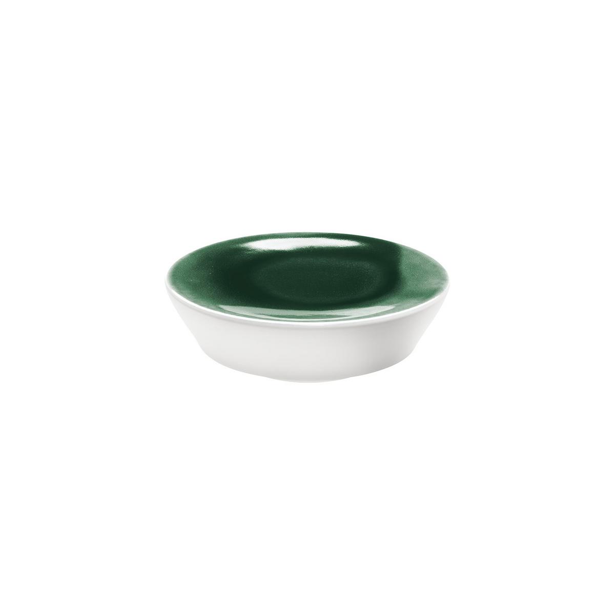 Der Rand der Teller "Emerald" ist aus mattem, samtig weich geschliffenem Biskuit-Porzellan. Im Kontrast dazu bestechen die Spiegel der Teller durch einen glänzenden Grünton. Die lebendige Hochbrandglasur changiert von saftigem Blattgrün bis zu einer intensiven Smaragdfarbe.