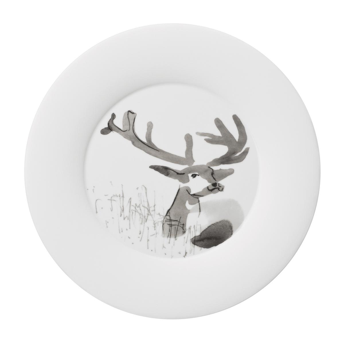 "Wildteller: Dies ist mal ein sympathisch röhrender Hirsch auf dem Desserteller aus der Serie Piqueur im Aquarellstil."