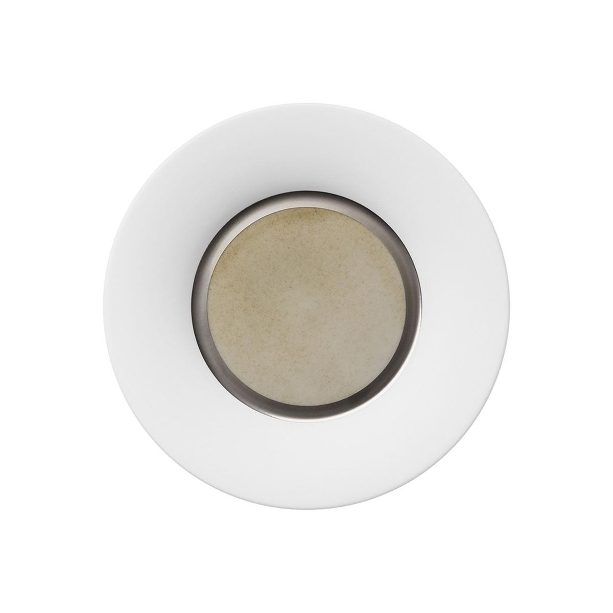 Der Rand der Teller "Silent Brass" ist aus mattem, samtig weich geschliffenem Biskuit-Porzellan. Im Kontrast dazu bestechen die Spiegel der Teller durch einen metallischen Glanz im changierenden Messington. Durch die innovative Glasur auf der Basis von gemahlenem Basalt entsteht der Eindruck, als wären Teller und Schälchen mit flüssigem Metall übergossen. Ein Platinstreifen akzentuiert die Trennlinie zwischen seidig mattem Biskuitporzellan und der glänzenden Glasur.