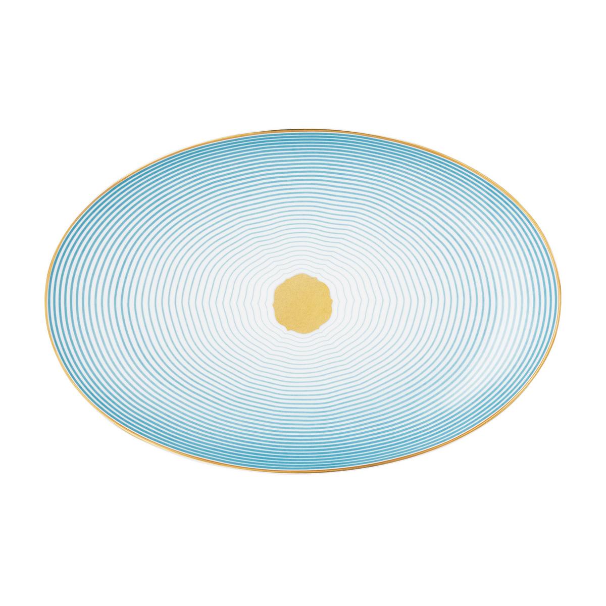 Mal ist es die goldene muschelförmige Pastille, aus der, einer Aura ähnlich, die Strahlen im gräulichen Hellblau ausgehen und zum Rand hin leichter und schmaler werden. Mal sind das die breiteren Linien, die zum Spiegel hin feiner und muschelförmiger werden. Der edle und moderne Farbton strahlt subtile Eleganz aus und unterstreicht die weiche und feminine Linienführung. "Aura" lässt sich zum Beispiel wunderbar mit "Polka Gold" von Raynaud kombinieren.