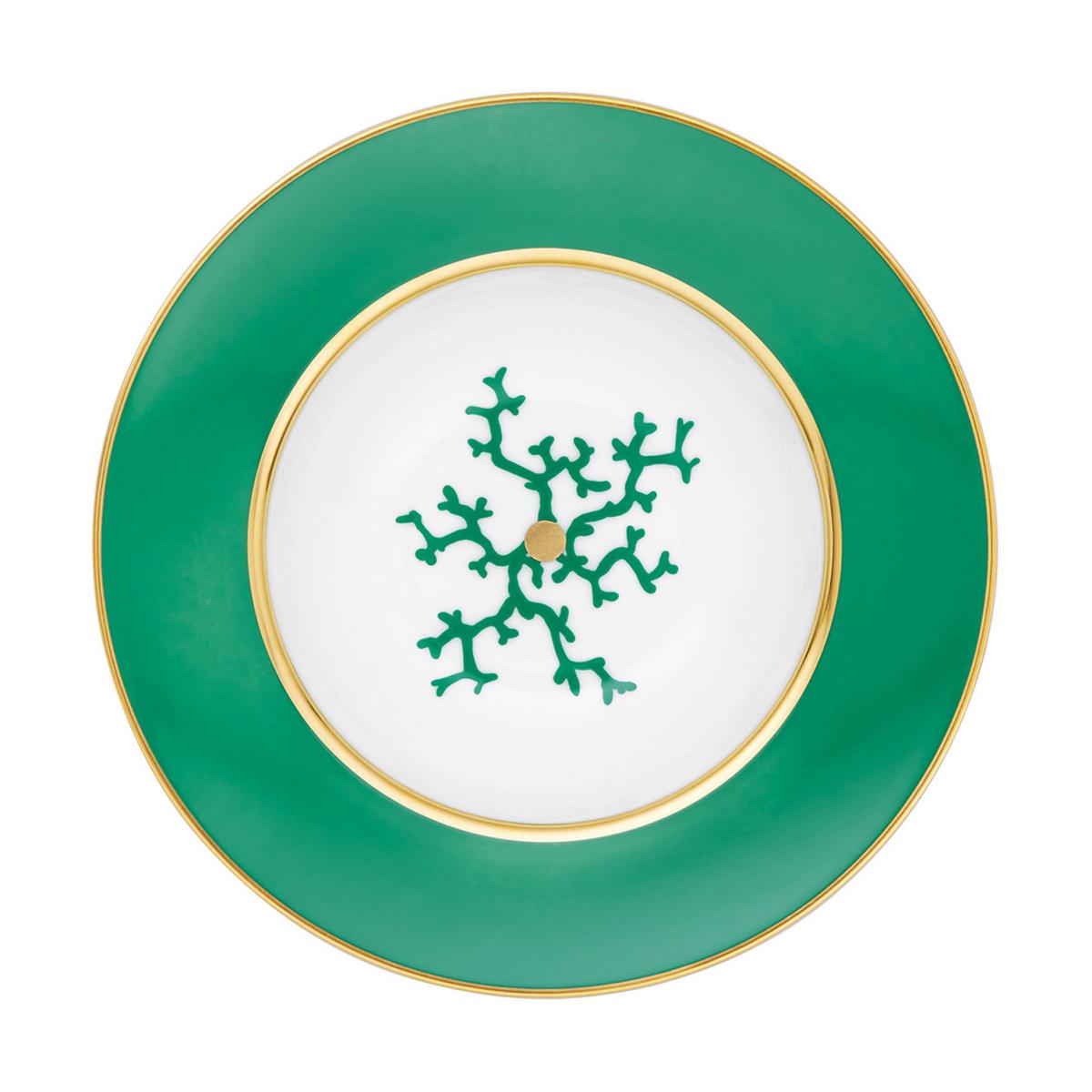 Die smaragdgrüne Farbe, die die ursprüngliche, korallenrote Kollektion ("Cristobal Koralle") und die ultramarinblaue Version ("Cristobal Marine") ergänzt, taucht in den Abgrund und die geheimnisvollen Meeresgründe ein. Mal ist es dicht und intensiv auf den Korallengriffen der Tassen oder auf den Knäufen der Teekannen, mal weich, kontrastreich, nuanciert und aquarelliert auf den mit Korallenmotiven verzierten Tellern. Sei es mit kleinen Akzenten auf dem Tisch oder in einer opulenten Inszenierung, Cristobal von Raynaud komponiert und erfindet Eleganz und Großzügigkeit neu; beides Aushängeschilder des begabten Dekorateurs.