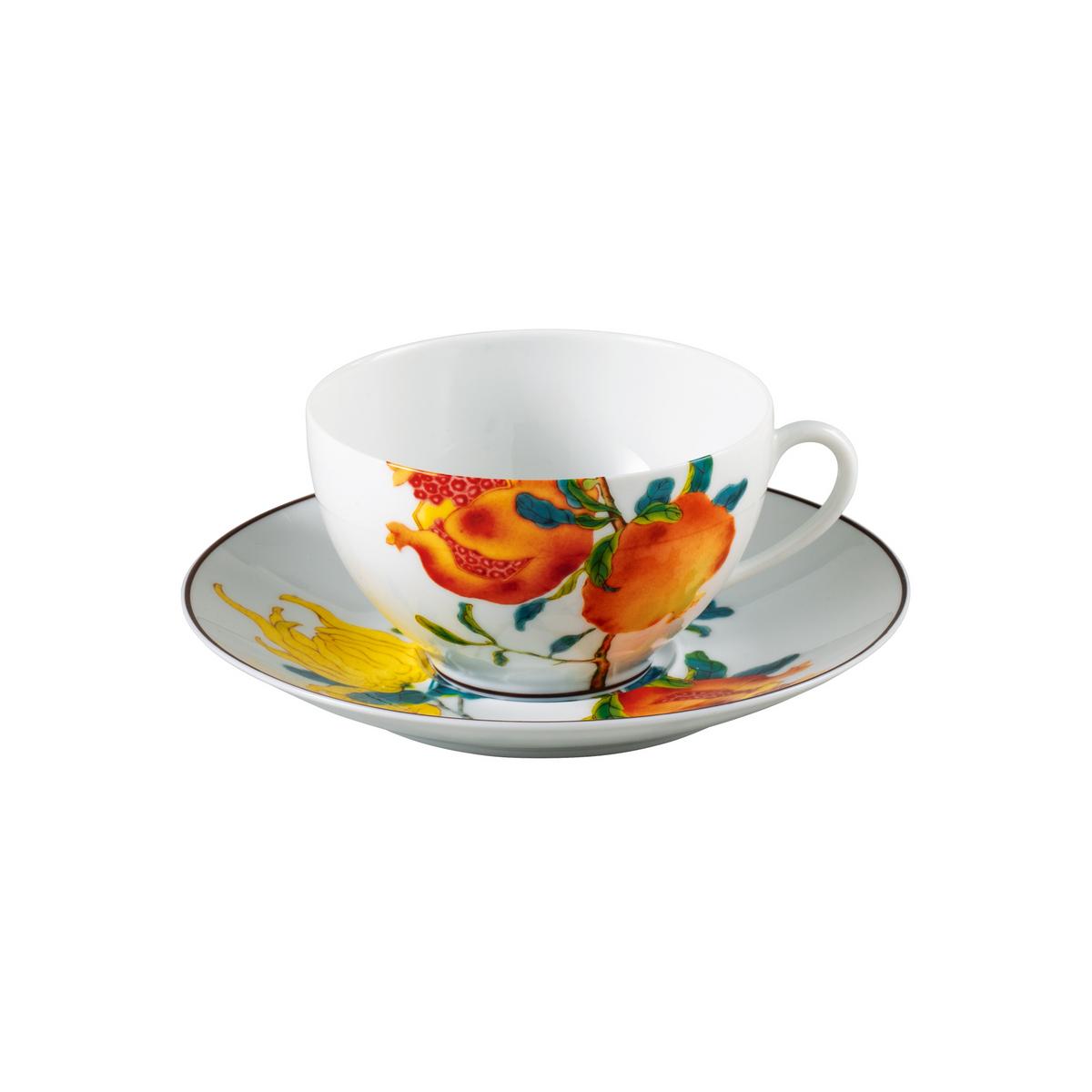 Voller Charme präsentiert sich das Service "Harmonia" von Raynaud. Das naturalistische Dekor ist angelehnt an das goldene chinesische Zeitalter. Die Ursprünge des Designs reichen bis ins 18. Jahrhundert an den chinesischen Kaiserhof zurück. Drei florale Inspirationen der folgenden Fruchtbäume sind das Hauptthema der Kollektion "Harmonia": eine sich öffnende Granatapfelfrucht, Granatapfelblüten und eine abgewandelte Form der Zitronenfrucht - besser bekannt als "Buddhas Hand". Die frischen Farben auf dem Service "Harmonia" inszenieren Gastlichkeit mit der Leichtigkeit eines Frühsommertages.