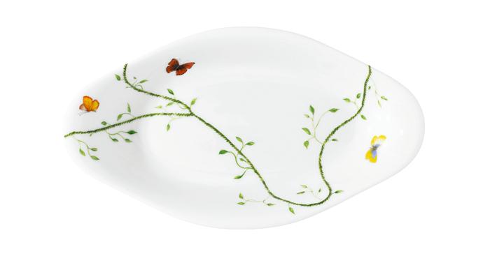 "Verspielt! Junge Triebe locken bunte Vögel und Schmetterlinge an. Gemeinsam bringen sie Lebensfreude auf blütenweißes Limoges-Porzellan."