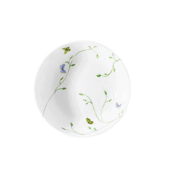 "Verspielt! Junge Triebe locken bunte Vögel und Schmetterlinge an. Gemeinsam bringen sie Lebensfreude auf blütenweißes Limoges-Porzellan."