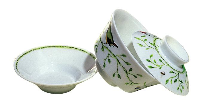 "Verspielt! Junge Triebe locken bunte Vögel und Schmetterlinge an. Gemeinsam bringen sie Lebensfreude auf blütenweißes Limoges-Porzellan."
