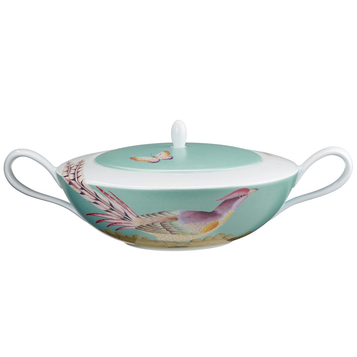 Auf dem Limoges-Porzellanservice "Paradis" von Raynaud gibt es bunte Paradiesvögel sowie exotische Pflanzen und Schmetterlinge zu bestaunen. Während des Designprozesses wurde von Raynaud genau darauf geachtet, dass jedes Einzelteil ein anderes, paradiesisches Dekor erhält. Die Einzelteile in Türkis sind seidig glänzend. Die weißen Porzellanteile sind rein weiß, besitzen aber ein seidenartiges Dekor.