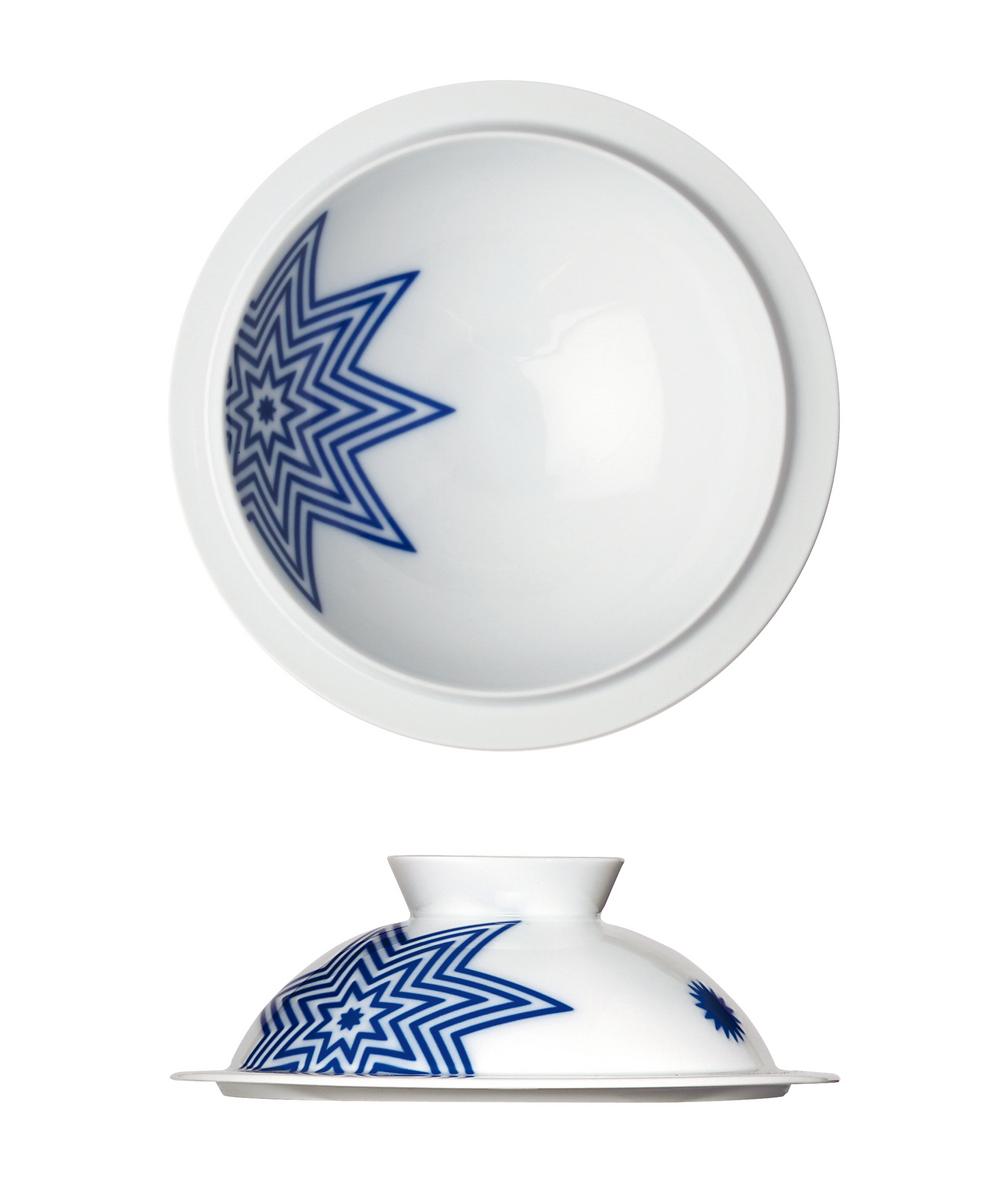 Das Tafelservice "Wunderkammer" von Sieger by Fürstenberg nimmt seine Betrachter mit auf eine fantastische Reise. In einem wundervollen Blauton sind Blumen und Schmetterlinge gestaltet, die sich um geometrische Figuren wie den Sieger Stern oder perfekt geformte Kreise ranken.