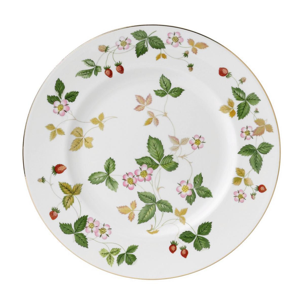 Das weiße Tafelservice ist verziert mit roten Walderbeeren, rosa Erbeerblüten und grünen Blättern. Eine zarte Applikation aus hochwertigem 22-karätigem Gold an den Rändern setzt "Wild Strawberry" von Wedgwood luxuriös in Szene.