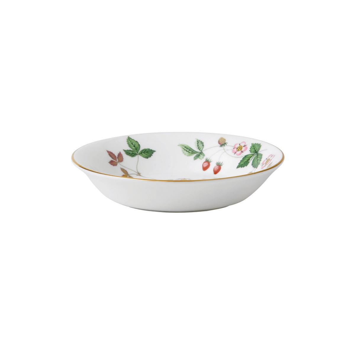 Das weiße Tafelservice ist verziert mit roten Walderbeeren, rosa Erbeerblüten und grünen Blättern. Eine zarte Applikation aus hochwertigem 22-karätigem Gold an den Rändern setzt "Wild Strawberry" von Wedgwood luxuriös in Szene.
