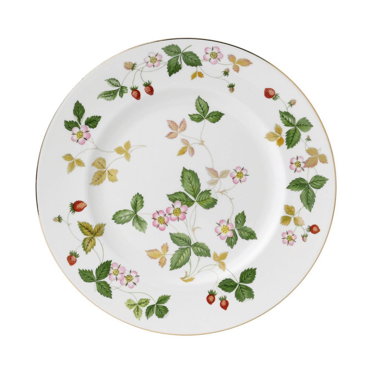 Das weiße Tafelservice ist verziert mit roten Walderbeeren, rosa Erbeerblüten und grünen Blättern. Eine zarte Applikation aus hochwertigem 22-karätigem Gold an den Rändern setzt "Wild Strawberry" von Wedgwood luxuriös in Szene.