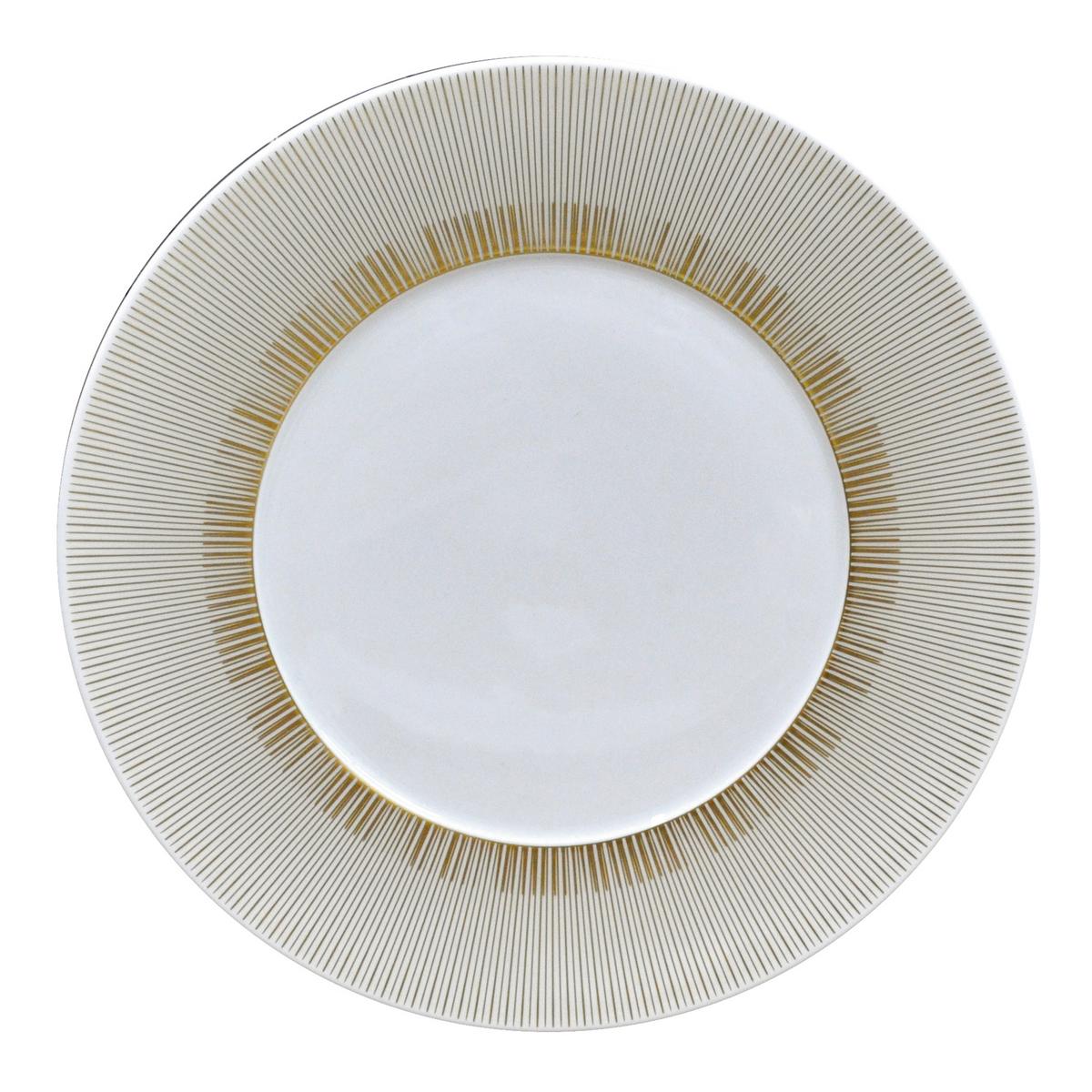 Die Formen des Tafelservice "Sol" von Bernardaud sind eigentlich schlicht und zurückhaltend. Dennoch hat das Service von Bernardaud eine enorme Präsenz und Ausstrahlung. Feine goldene Strahlen zieren die Teller und Tassen des Limoges-Porzellan Services "Sol". Trotz des auffälligen goldenen Dekors hat das Service "Sol" einen zeitlosen Charakter.
