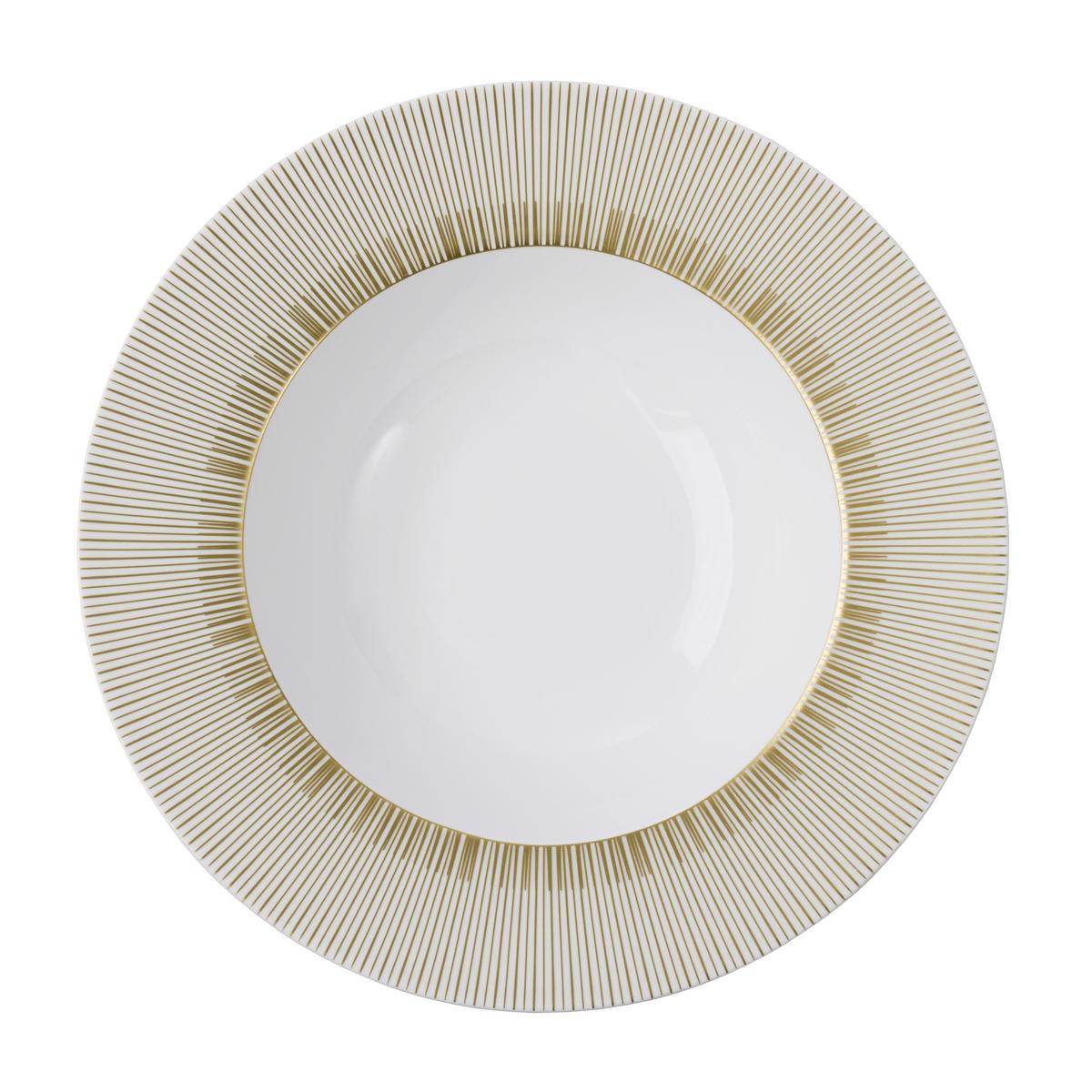 Die Formen des Tafelservice "Sol" von Bernardaud sind eigentlich schlicht und zurückhaltend. Dennoch hat das Service von Bernardaud eine enorme Präsenz und Ausstrahlung. Feine goldene Strahlen zieren die Teller und Tassen des Limoges-Porzellan Services "Sol". Trotz des auffälligen goldenen Dekors hat das Service "Sol" einen zeitlosen Charakter.