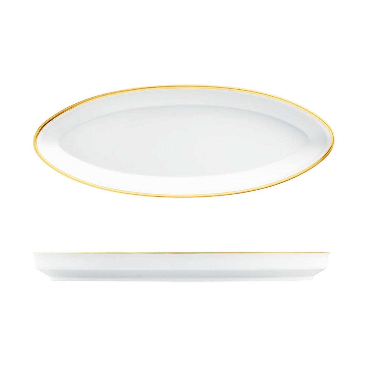 Auf einigen Tellern tritt der Goldrand in Kombination mit einem goldenen Scudo-Element auf, das, in unterschiedlicher Stärke und kombiniert mit kleinen Details, die klassische Form des Services untermalt.