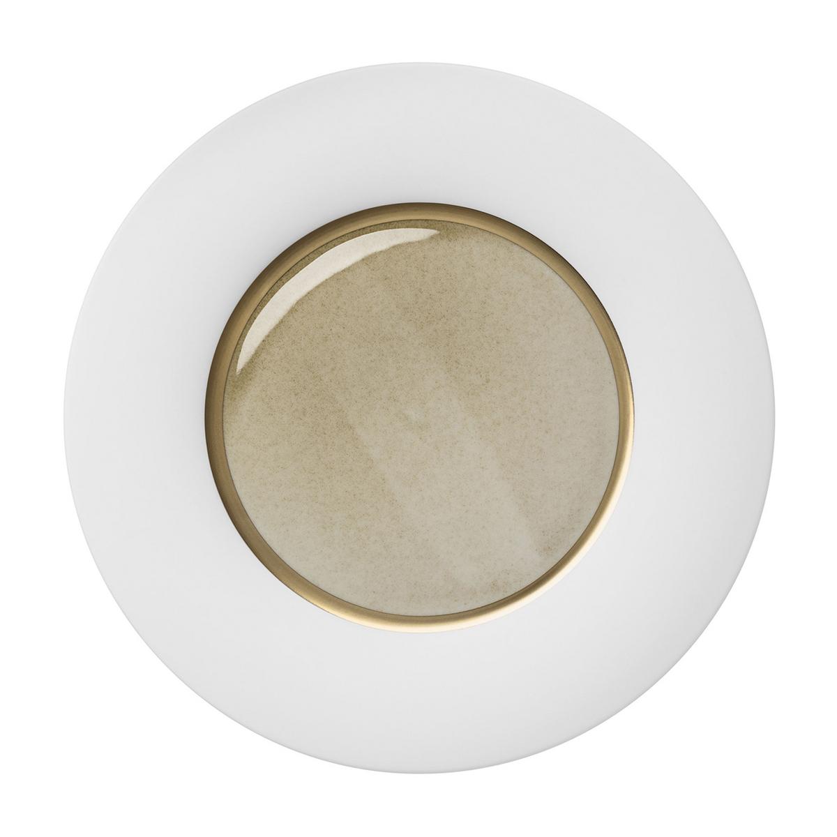Der Rand der Teller "Silent Brass" ist aus mattem, samtig weich geschliffenem Biskuit-Porzellan. Im Kontrast dazu bestechen die Spiegel der Teller durch einen metallischen Glanz im changierenden Messington. Durch die innovative Glasur auf der Basis von gemahlenem Basalt entsteht der Eindruck, als wären Teller und Schälchen mit flüssigem Metall übergossen. Ein präzise gezogener Goldstreifen verbindet diese Gegenpole miteinander.