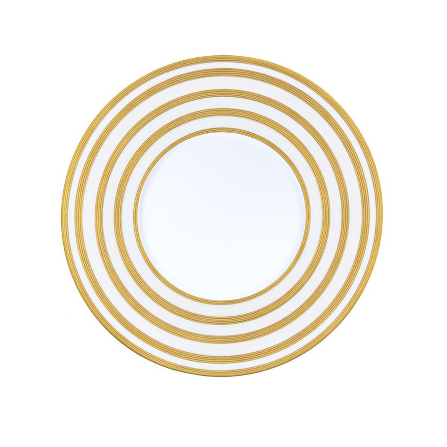 "Glanzvoller Mittelpunkt: Auf der festlichen Tafel darf ein Platzteller nicht fehlen. Er ist größer als ein Speiseteller und die Basis des Gedecks, auf den das Geschirr des jeweiligen Ganges gestellt wird. Einen goldfarbenen Rand hat der Platzteller aus dem Service Hémisphère Gold."