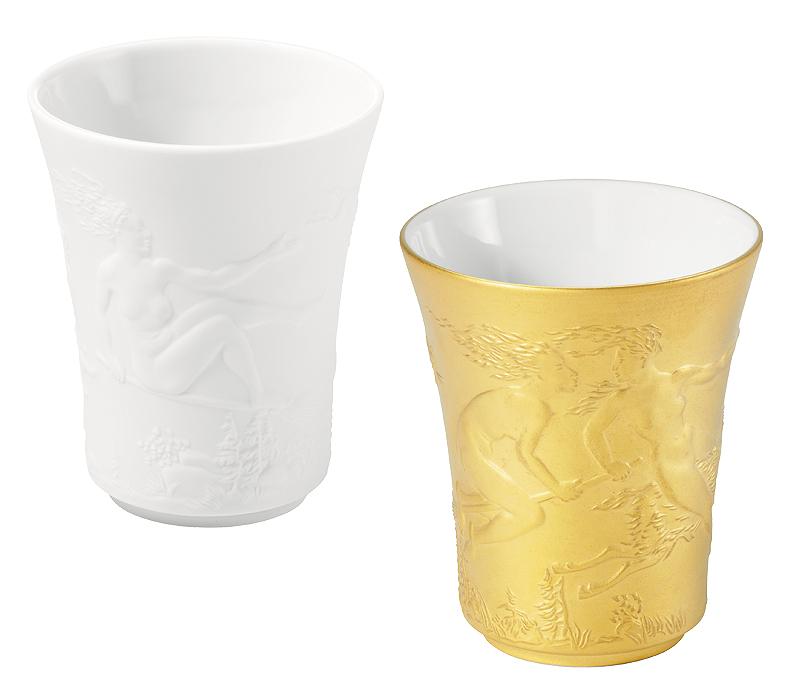 Der dekorative Becher wird in zwei Ausführungen angeboten: rein weiß oder mit vergoldeter Außenseite.