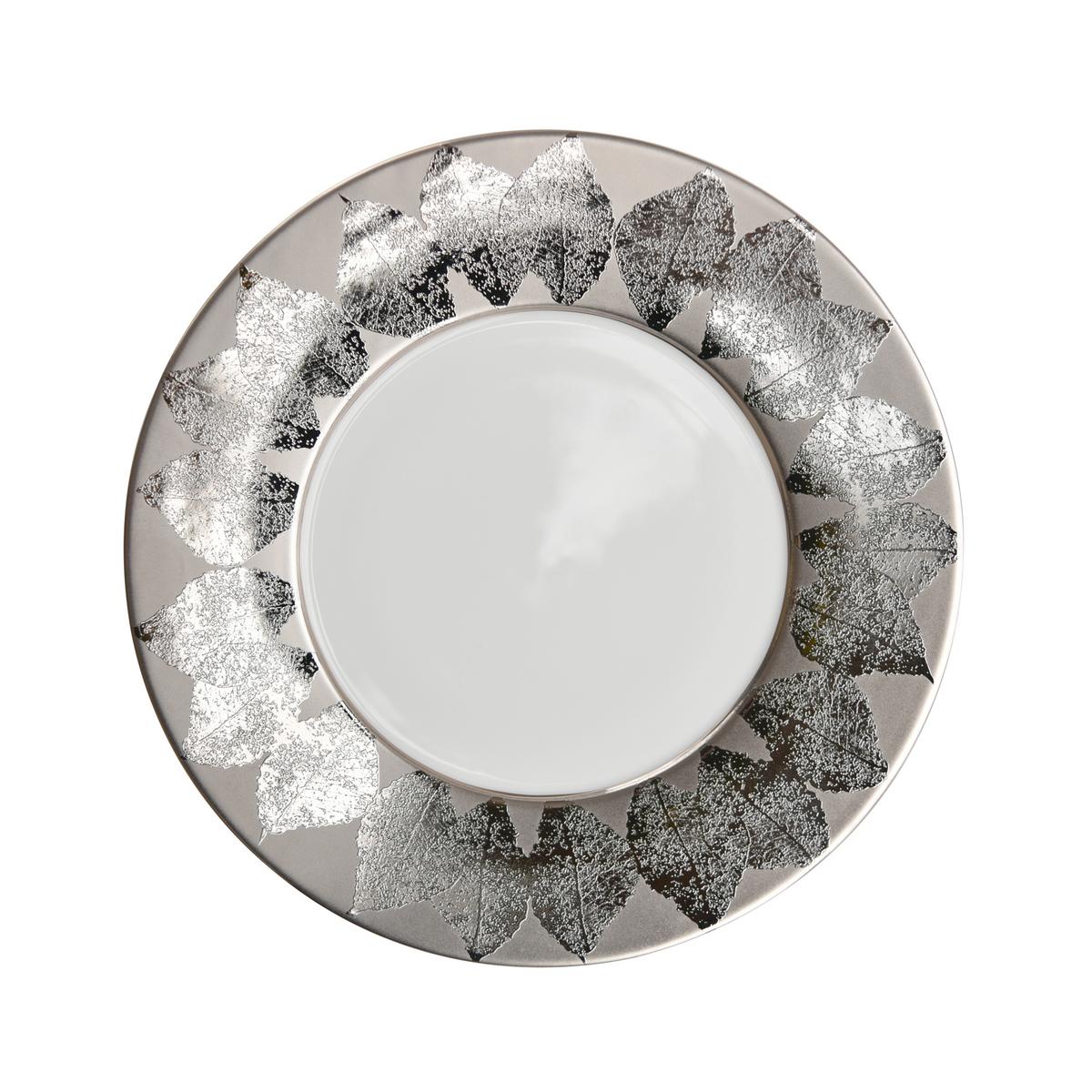 Das Service "Silva" von Bernardaud spielt mit geometrischen und floralen Mustern, dessen zarte Silber- und Platinnuancen auf dem strahlend weißen Limoges-Porzellan besonders schön zur Geltung kommen. Der Name "Silva" kommt aus dem Lateinischen und bedeutet übersetzt "Wald". Das Bernardaud Tafelservice lädt uns ein, die Schönheit der Natur zu bewundern und genauer hinzuschauen: zarte Blattadern und Pflanzenfasern zieren den Rand der Teller. "Silva" von Bernardaud ist ein raffiniertes Service, sachlich und dennoch verspielt, modern und dennoch zeitlos.
