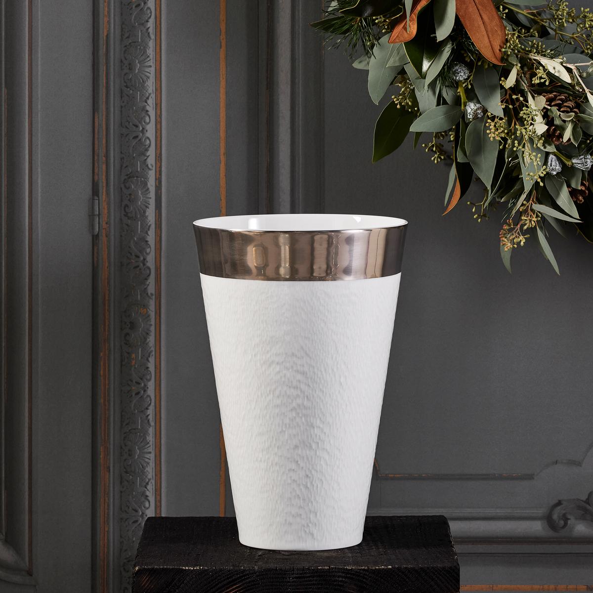 Nicht nur die Formen-Vielfalt – von rund über spindel- bis hin zu sternenförmig – auch das Spiel der Oberflächen verführt die Sinne. Körnige Strukturen vereinen sich mit glatten und glänzenden Flächen zu einem harmonischen Ganzen. Geadelt wir das pure Weiß des Raynaud Limoges-Porzellans mit platinveredelten Rändern, Tellerfahnen und Innenseiten.