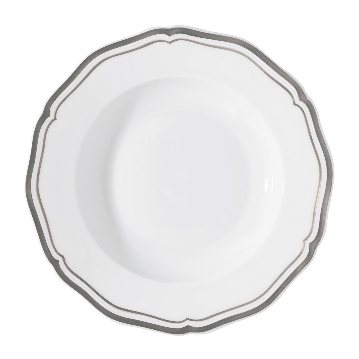 Das Tafelservice "Polka Platin" von Raynaud glänzt im berühmten Weiß des Limoges-Porzellans mit silberner Veredelung an den Rändern. Das weiße Service ist mit einem doppelten handgemalten Rand in Platin eingerahmt. "Polka Platin" ist ein Klassiker von Raynaud und lässt sich wunderbar mit anderen Raynaud Servicen mischen bzw. erweitern.