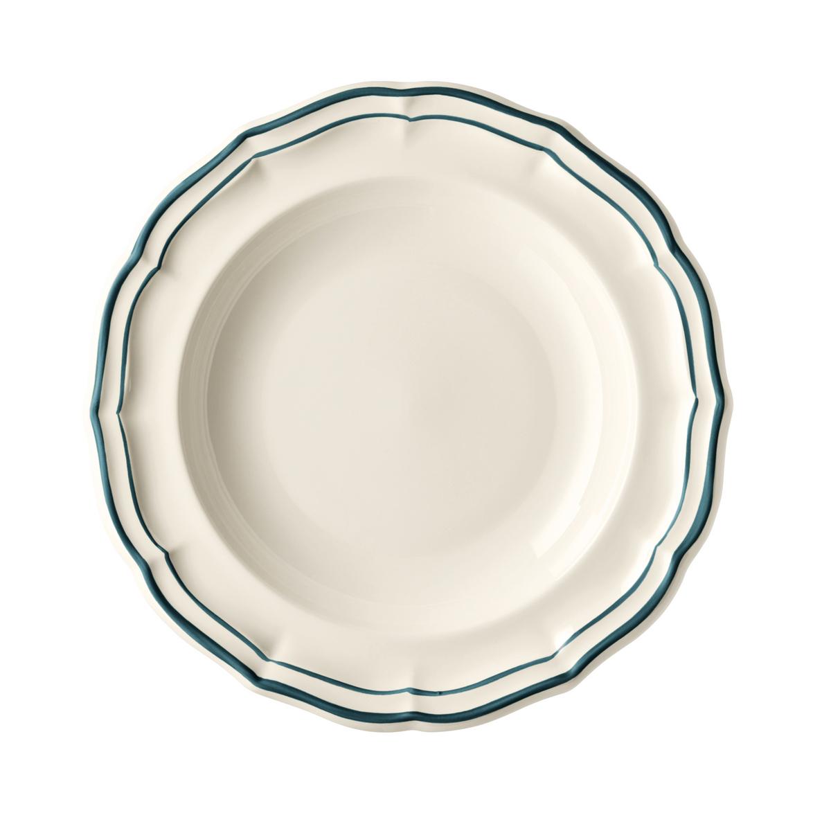 Als Solitär passt das schlichte und elegante Service "Filets Acapulco" zu einem klassischen Interieur ebenso wie zu einem Ambiente im Landhausstil. Mit seinem Rand in leuchtendem Petrol ist das Tafelservice von Gien zudem perfekt für eine sommerliche Tafel im maritimen Stil.