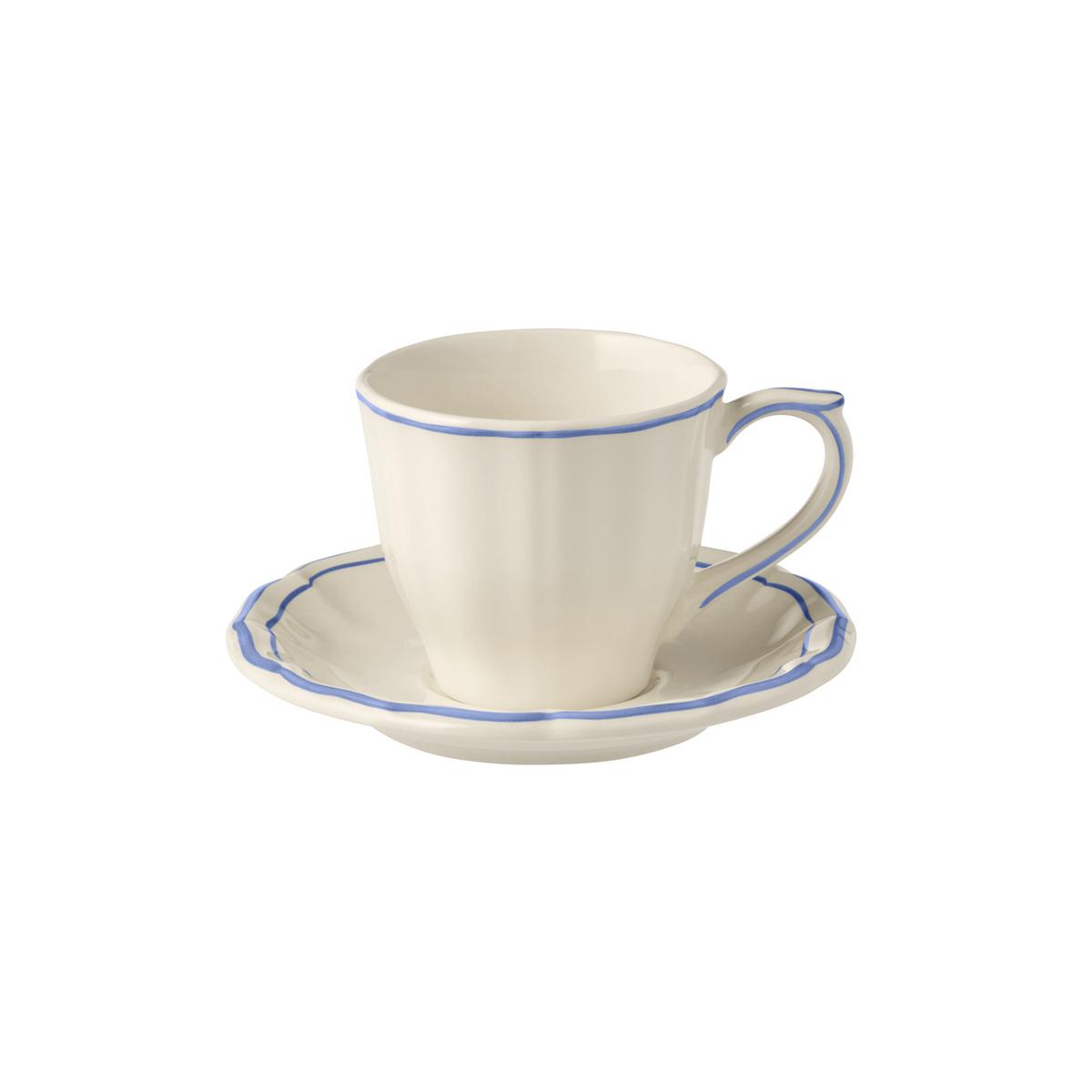 "Filets Bleus" von Gien ist ein ecrufarbenes Service voller Charme, schlicht und doch raffiniert durch den von Hand aufgetragenen blauen Strich, der die Form eines jeden Teils schön zur Geltung bringt und die Eleganz unterstreicht.