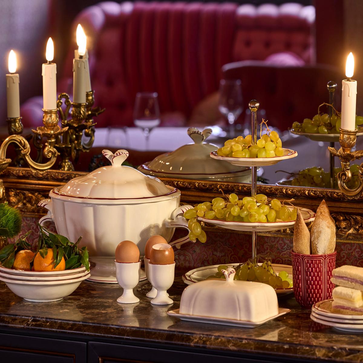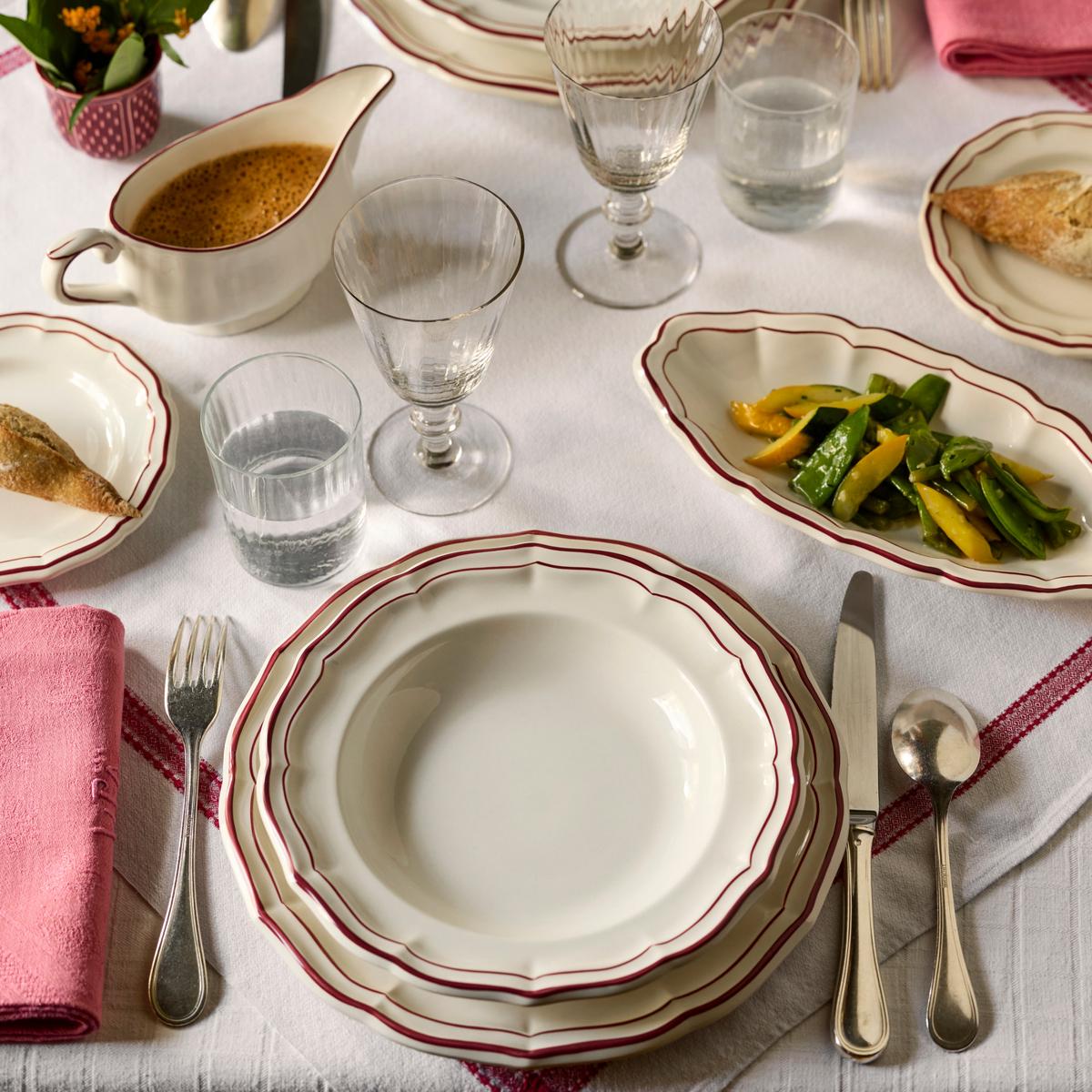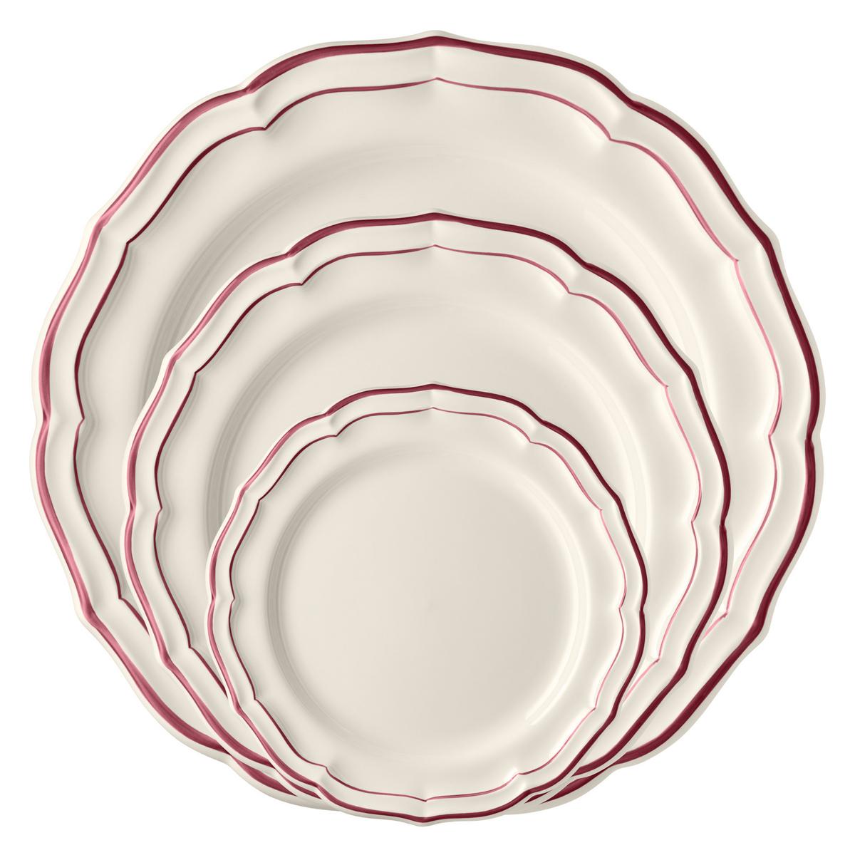 Das Service "Filets Bordeaux" ist eine neue Farbvariante des berühmten blauen Klassikers "Filets Bleu" aus dem Hause Gien. Die zauberhafte Muschelform des Services aus ecrufarbener Fayence schmücken handgemalte Linien in der Farbe dunkelrot (Bordeaux). Die zarten per Hand aufgetragenen Pinselstriche machen jedes Stück zu einem Unikat.