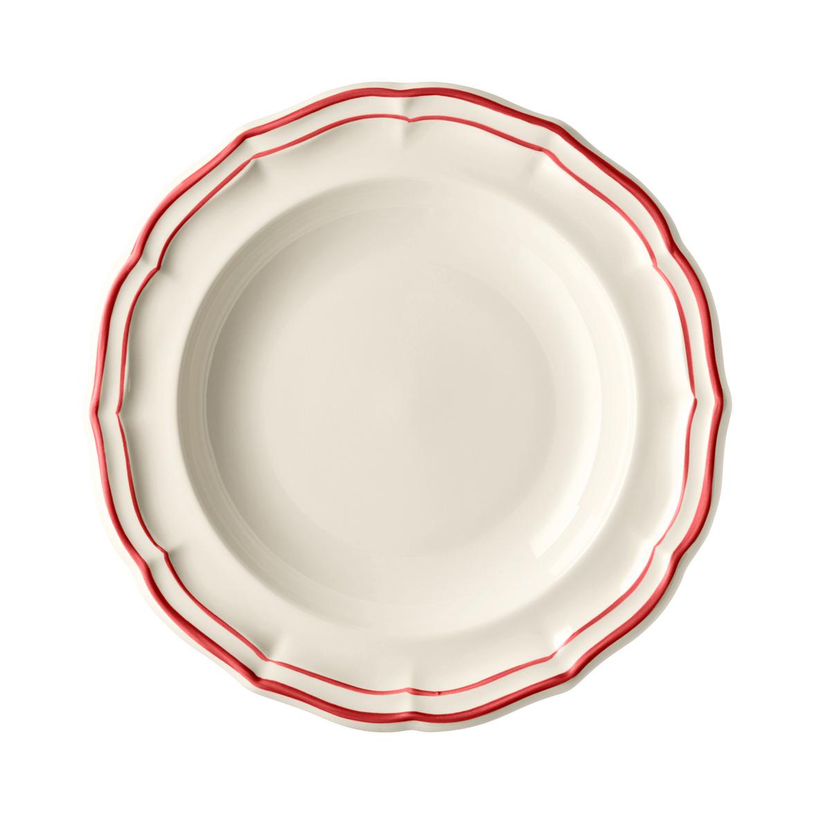 Das Service "Filets Rouge" ist eine neue Farbvariante des berühmten blauen Klassikers aus dem Hause Gien. Die zauberhafte Muschelform des Services aus ecrufarbener Fayence schmücken handgemalte Linien in der Farbe Rot.