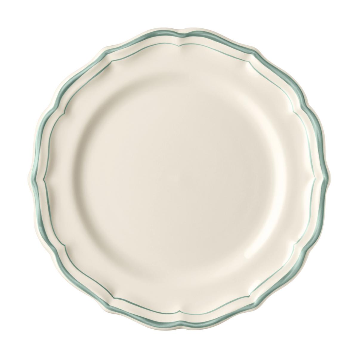 Das Service "Filets Seladon" ist eine neue Farbvariante des berühmten blauen Klassikers "Filets Bleu" aus dem Hause Gien. Die zauberhafte Muschelform des Services aus ecrufarbener Fayence schmücken handgemalte Linien in der Farbe Seladon (türkis/blaugrün). Die zarten per Hand aufgetragenen Pinselstriche machen jedes Stück zu einem Unikat.