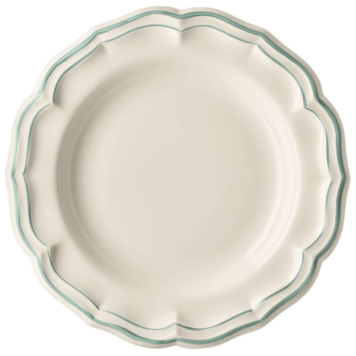 Das Service "Filets Seladon" ist eine neue Farbvariante des berühmten blauen Klassikers "Filets Bleu" aus dem Hause Gien. Die zauberhafte Muschelform des Services aus ecrufarbener Fayence schmücken handgemalte Linien in der Farbe Seladon (türkis/blaugrün). Die zarten per Hand aufgetragenen Pinselstriche machen jedes Stück zu einem Unikat.