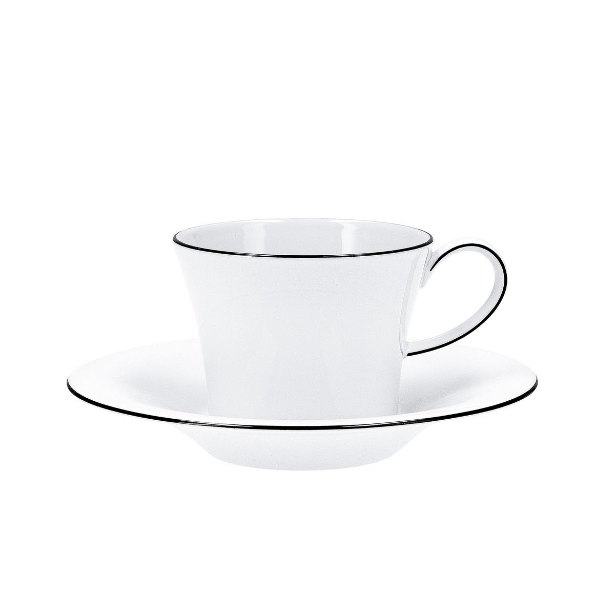 Das weiße Porzellanservice "Berlin Canto" von KPM ist mit einem schwarzen, von Hand aufgetragenen Rand dekoriert.