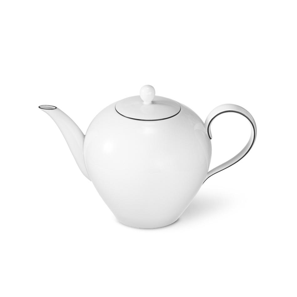 Das weiße Porzellanservice "Urbino Canto" von KPM ist mit einem schwarzen, von Hand aufgetragenen Rand dekoriert. Die feine farbige Linie wird im Scharffeuer bei ca. 1.300°C gebrannt und ist dadurch spülmaschinengeeignet.