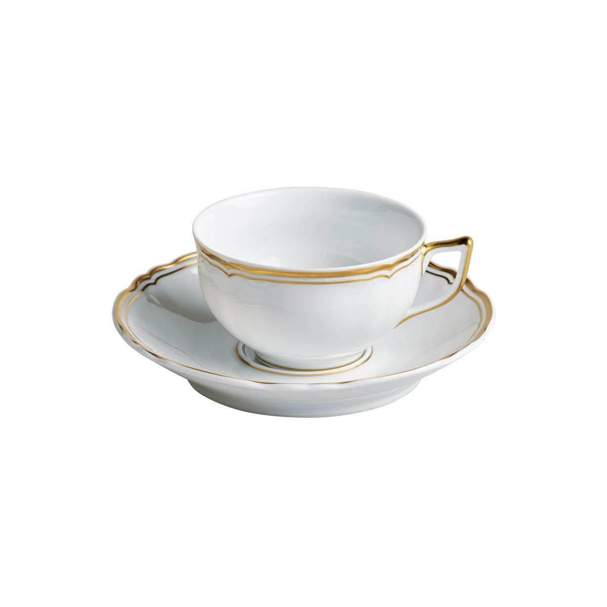 Die Kollektion "Mazurka" von Raynaud basiert auf einer traditionellen Grundform von der Zeit Ludwigs des XV. Die geschwungenen und vergoldeten Konturen veredeln das hochwertige Limoges-Porzellan auf königliche Art und Weise. Die Goldränder werden in reiner Handarbeit auf die Einzelteile aufgebracht.