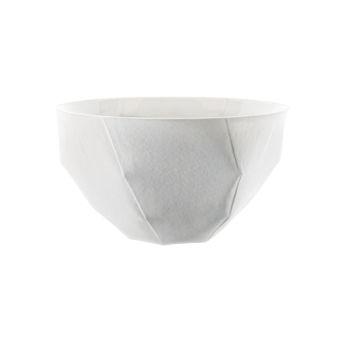 Künstlerin Ruth Garvich hat für dieses Porzellan zunächst handgeschöpftes Papier zu Vasen, Schalen und Tellern geformt. Aus den filigranen Modellen entstanden dann handgefertigte Porzellanobjekte, die Falten, Bögen und Spannungen der Papierentwürfe perfekt abbilden.