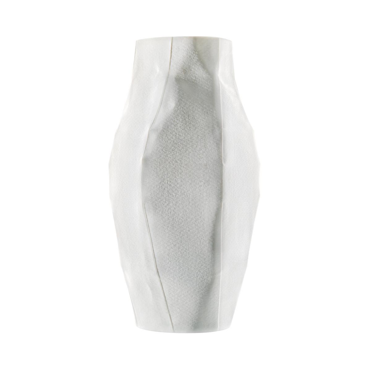 Künstlerin Ruth Garvich hat für dieses Porzellan zunächst handgeschöpftes Papier zu Vasen, Schalen und Tellern geformt. Aus den filigranen Modellen entstanden dann handgefertigte Porzellanobjekte, die Falten, Bögen und Spannungen der Papierentwürfe perfekt abbilden.