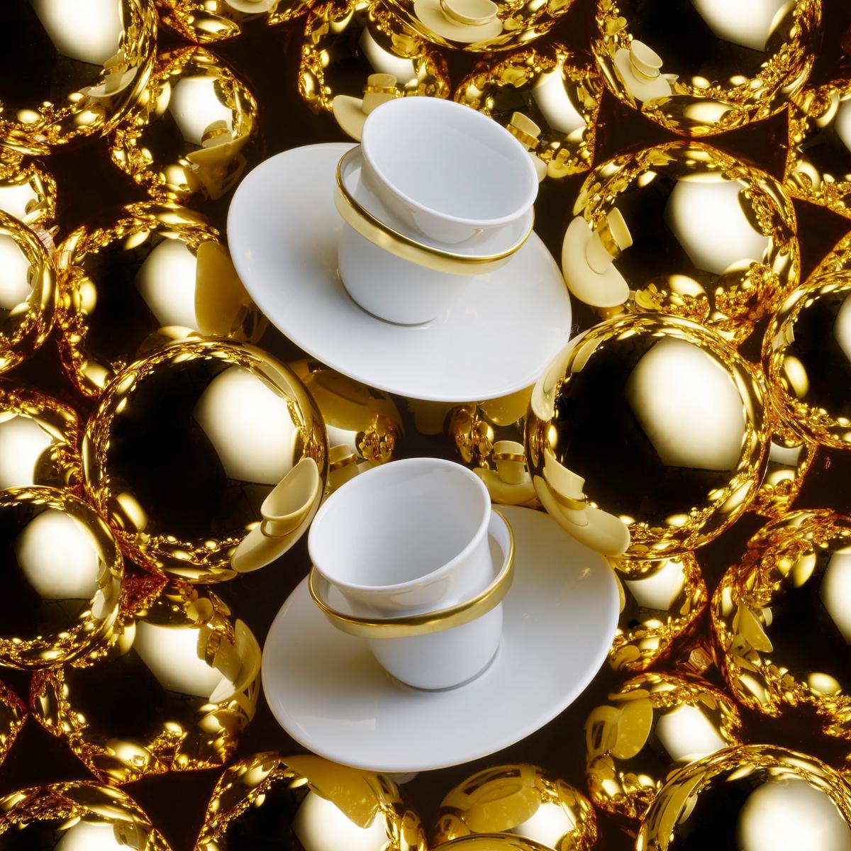 Ein Design von Sylvain Dubuisson für Bernardaud: Die Espressotassen mit Unterteller "Anno" aus Limoges-Porzellan sind mit einem platinfarbenen oder goldenen Ring erhältlich und werden im 2er-Set in einer Geschenkbox geliefert.