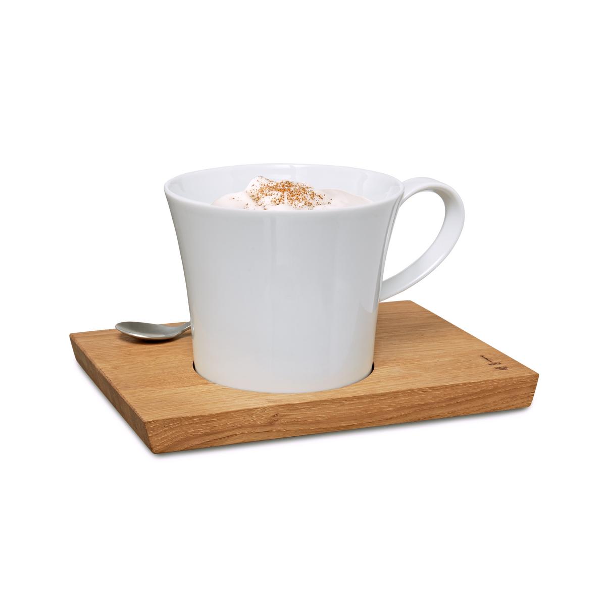 Ob Tee, Kakao oder Milchkaffee – in der Bürotasse "Berlin" von KPM wird jedes Getränk zum besonderen Genuss. In das Massivholzbrett wurde ein Magnet integriert, so dass der dazugehörige Löffel aus Edelstahl immer an seinem Platz zu schweben scheint. Die große Porzellantasse mit einem Volumen von 0,3 l gewinnt durch das Eichenholzbrett und den Kaffeelöffel an Ausdruckskraft.