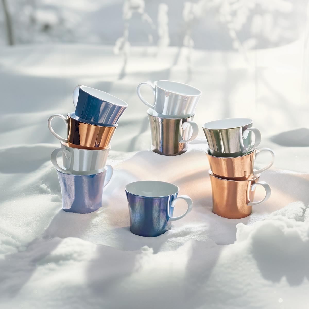 Die Tassen aus der erfolgreichen KPM Serie "Berlin" glänzen ab sofort in irisierenden Farben. Mit einem innovativen Verfahren wird die Frühstückstasse "Colours of Berlin" mit sogenannter Lüsterfarbe per Hand besprüht. Erst nach dem Farbbrand im Ofen kommt der Perlmuttglanz zum Vorschein.