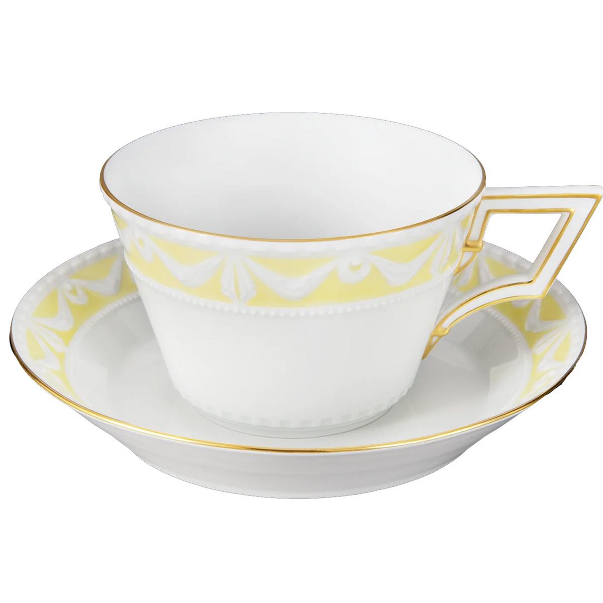 Die Tasse mit Unterteller ist in vielen Farben erhältlich und wird in aufwändiger Handmalerei hergestellt.