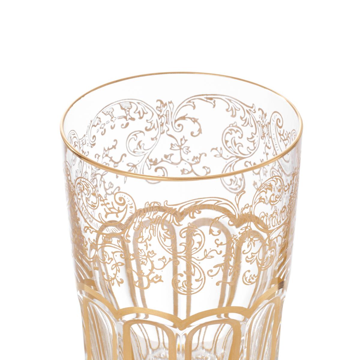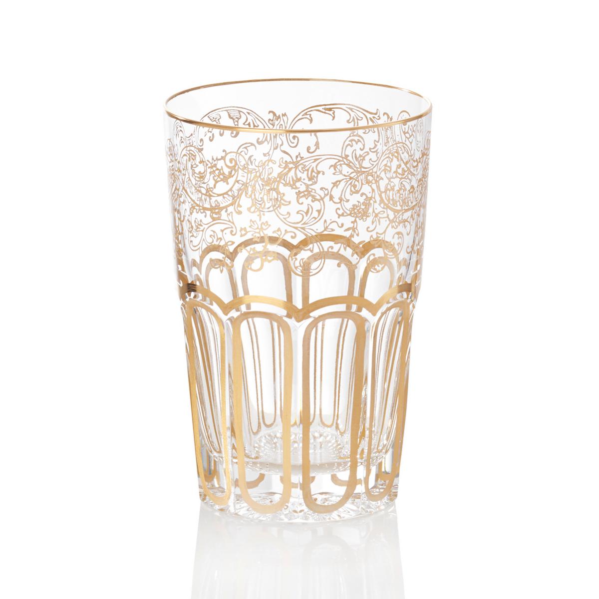 Die Teegläser "Rabat" von Saint-Louis wirken wie dem arabischen Märchen "1001 Nacht" entnommen: Ihre Edelstein-farbenen Kristallglaskörper leuchten intensiv in Rubinrot, Smaragdgrün oder Saphirblau, und sind mit 24-karätigen Goldmustern und einem prunkvollen Schliff reich verziert.