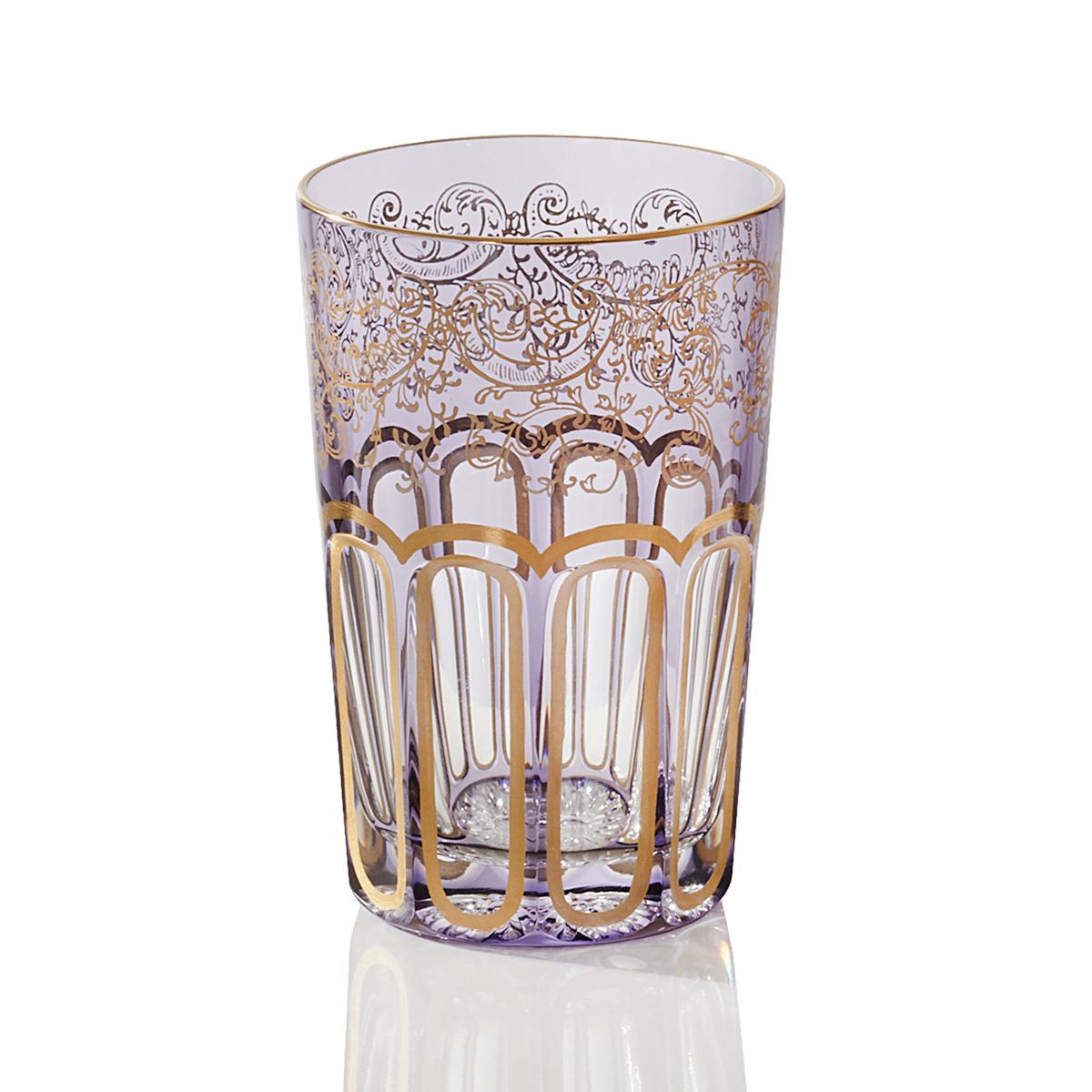 Die Teegläser "Rabat" von Saint-Louis wirken wie dem arabischen Märchen "1001 Nacht" entnommen: Ihre Edelstein-farbenen Kristallglaskörper leuchten intensiv in Rubinrot, Smaragdgrün oder Saphirblau, und sind mit 24-karätigen Goldmustern und einem prunkvollen Schliff reich verziert.