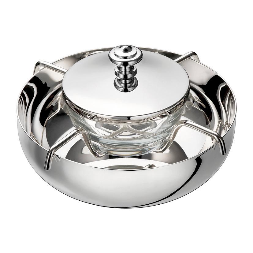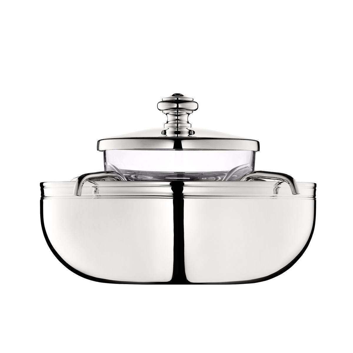 Die versilberte Kaviarschale "Albi" von Christofle sorgt dafür, dass die kostbare Delikatesse standesgemäß und gut gekühlt serviert werden kann, nämlich in einer geschmacksneutralen Glasdose. In der Silberschale darunter können Sie zur Kühlung ein Eisbett zubereiten.