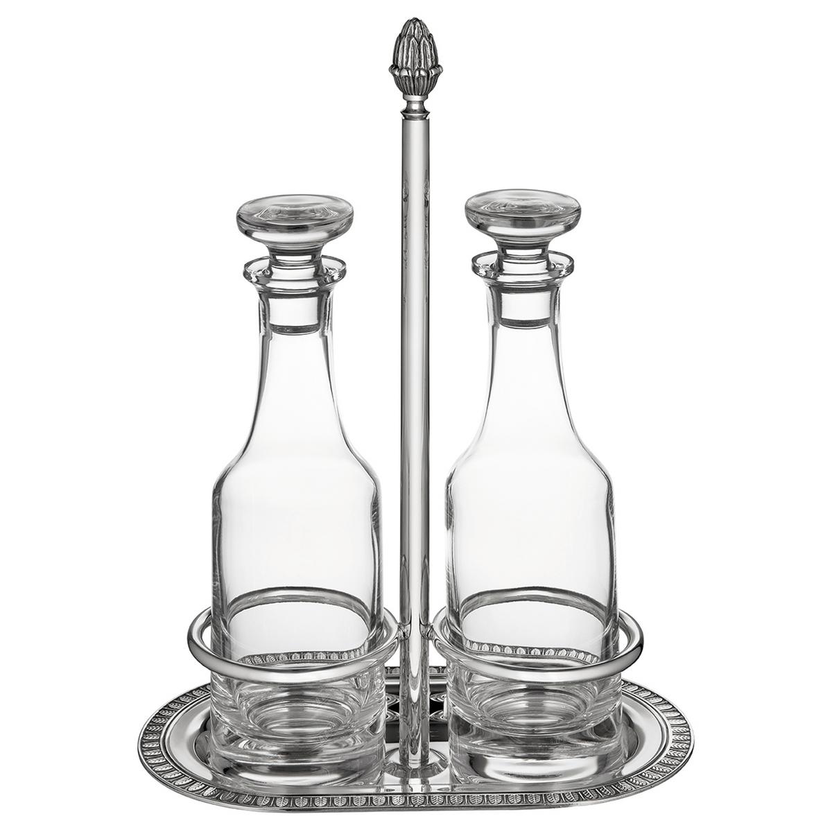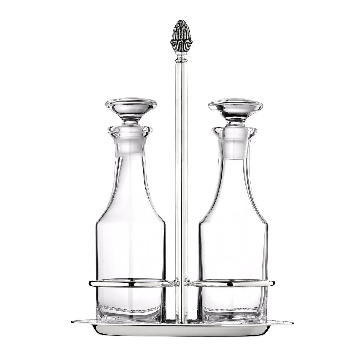 Der Essig & Ölständer "Malmaison" von Christofle vereint zwei weithalsige Glaskaraffen in einem versilberten Ständer im typischen "Malmaison"-Design. Die Serie "Malmaison" orientiert sich am französischen Empire-Stil des frühen 19. Jahrhunderts. Der wiederum zeichnet sich durch seine Begeisterung für Motive der Antike aus. Daher ziert den Essig & Ölständer "Malmaison" ein Palmettenrand aus kleinen Palmwipfeln.