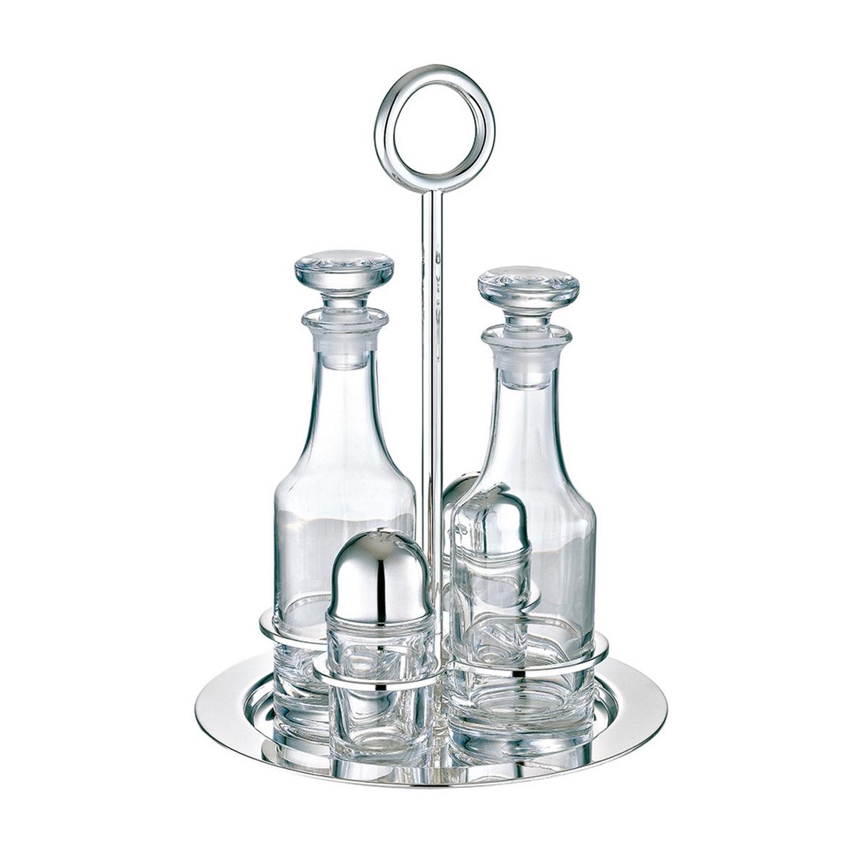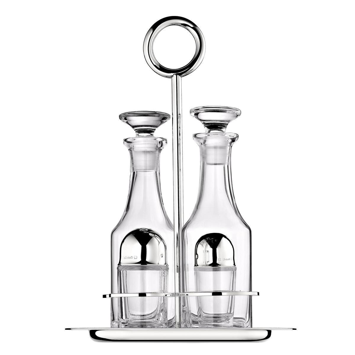 Die Ménagère "Vertigo" von Christofle ist eine wunderschöne Kombination aus Silber und Kristallglas mit stilvollen Rundungen. Sie vereint zwei Essig- & Öl-Karaffen mit zwei Salz- und Pfefferstreuern auf einem versilberten Ständer. Alle vier Gewürzelemente stehen dabei in ringförmigen Halterungen. Das typische "Vertigo"-Motiv taucht als Deko-Element auf und dient funktional als Griff an der Spitze des versilberten Gestells.