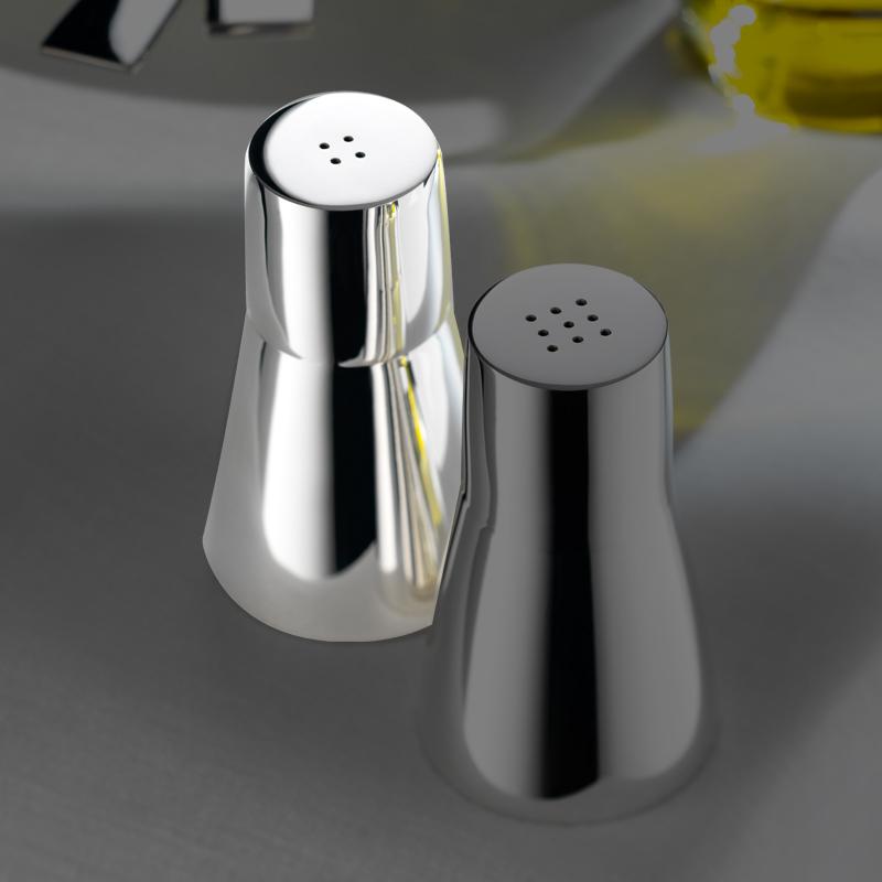 Mit ihren Entwürfen für Robbe & Berking setzt die Silberschmiedin Beate Leonards glänzende Akzente: die versilberten Salzstreuer, Pfefferstreuer, Salzmühle, Pfeffermühle und die Essig- und Öl-Flasche bringen Eleganz und Design auf einen dekorativen Nenner.