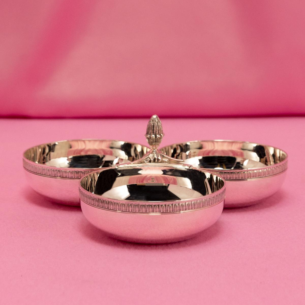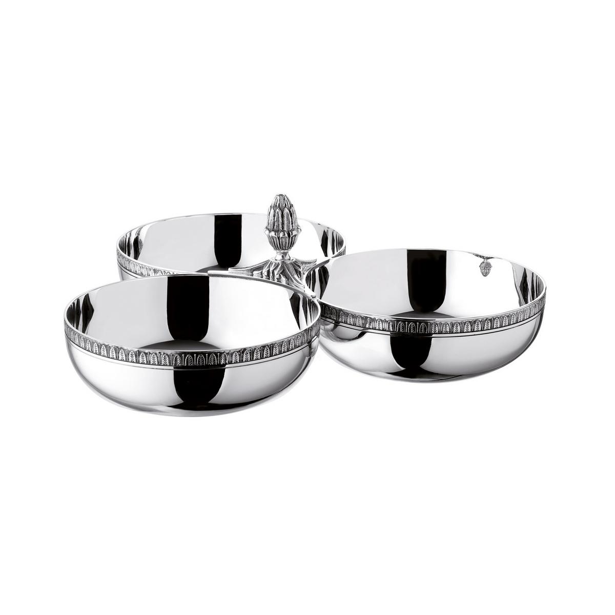 Als majestätisches Trio für Nüsse, Saucen, Snacks oder Canapés präsentiert sich diese versilberte Schälchenkombination "Malmaison". Seine fürstliche Ausstrahlung verdankt das Dreier-Schälchen von Christofle dabei seinen Anleihen bei Elementen des französischen Empire-Stils.