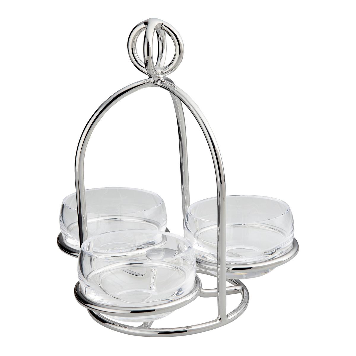Arrangieren Sie Ihre Knabbereien, Konfitüren, Soßen oder kleinen Vorspeisen mit besonderer Eleganz. Mithilfe der versilberten Dreier-Schälchen "Latitude" von Ercuis. Auf einem sanft ausladenden Gestell ruhen leicht erhaben drei bauchig geformte Kristallglasschälchen. So prominent präsentieren Sie auch Pralinen, Nüsse oder Canapés auf ausnehmend appetitliche Weise als Karussell der Köstlichkeiten.