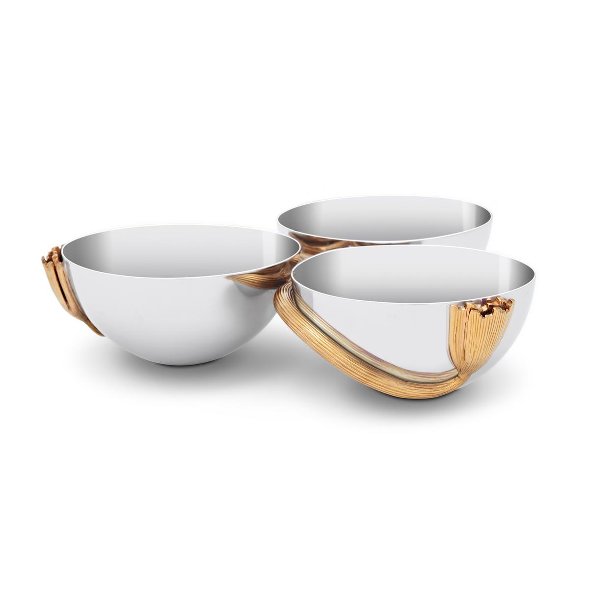 Platz für dreierlei Knabbereien, Konfitüren oder kleine Vorspeisen bietet das Dreier-Schälchen "Deco Leaves" von L‘Objet. Besonders edel wirkt die Kombination aus glänzendem Edelstahl mit vergoldeten Elementen. Die vergoldeten Elemente erinnern an ein stilisiertes Blütenblatt. Die Marke L'Objet legt großen Wert auf originelle Designs, leuchtende Farben und feine Handwerkskunst.