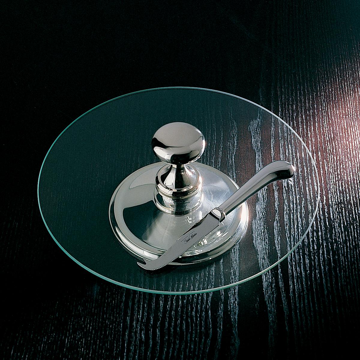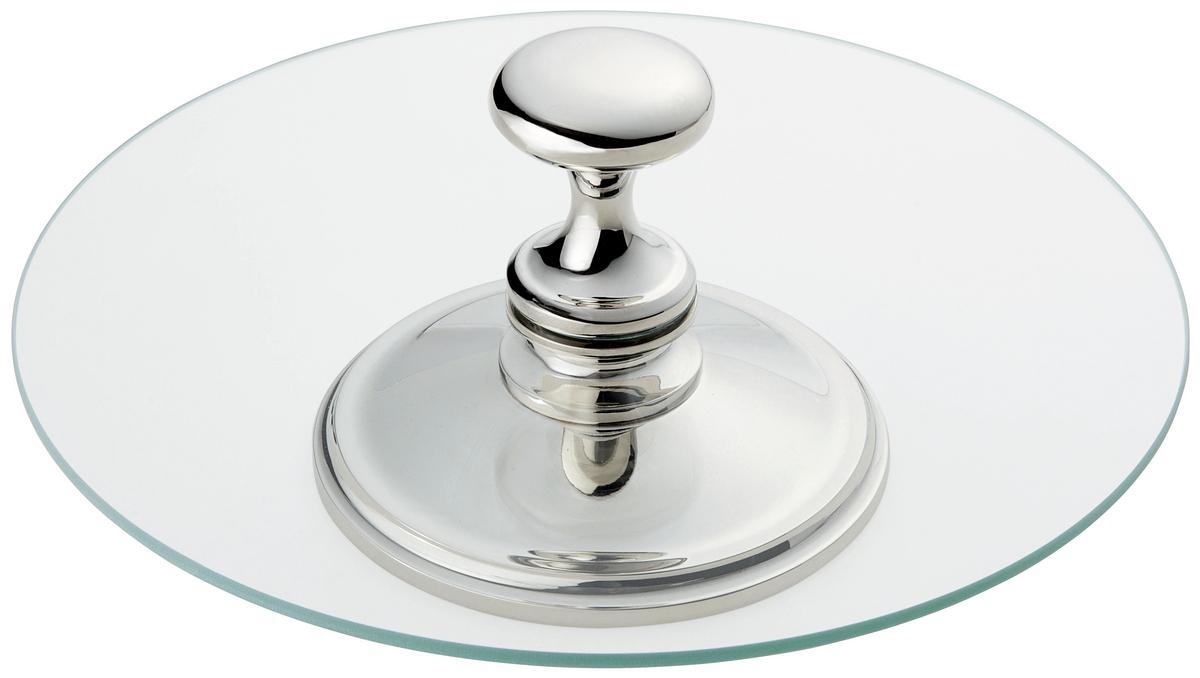 Unter dem Kristallglas prangt ein gewichtiger versilberter Sockel, der der Platte Präsenz und einen sicheren Stand verleiht. Darüber erhebt sich ein eleganter ebenfalls versilberter Griff, dessen Knauf einen interessanten Höhepunkt der Servierplatte bildet.