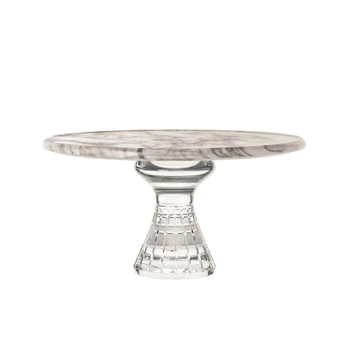 Ein Teil dieser spektakulären Kollektion ist die Platte auf Fuß "Quadrille". Auf der Carrara-Marmorplatte lassen sich Kuchen, Petits Fours, Käse oder Obst elegant und extravagant präsentieren. Der Fuß unter der Platte entsteht in der traditionellen Kristallglasmanufaktur Saint-Louis, wo das Glas mundgeblasen und handgeschliffen wird.